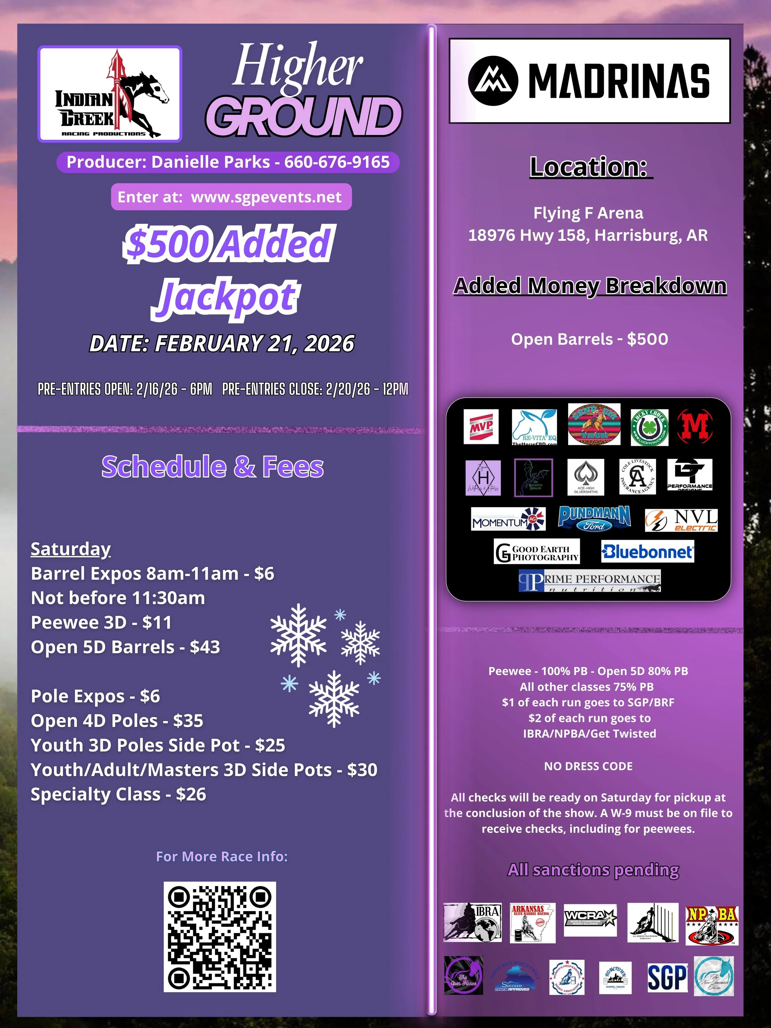 Entries will close when the first horse runs in each class. You MUST be paid before you run. This will be in the INDOOR arena and weather pending. PLEASE CHECK BEFORE YOU HAUL.