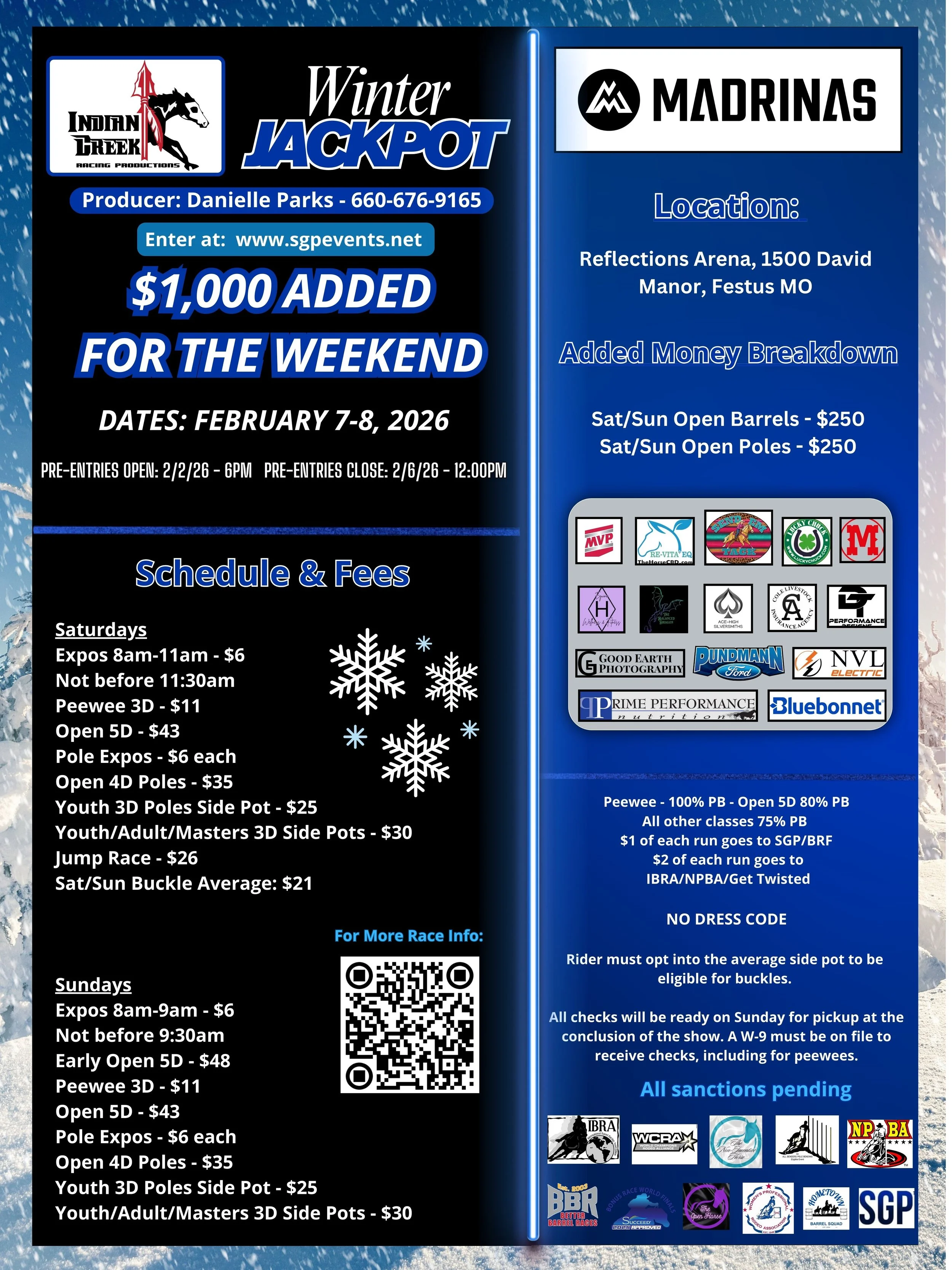 Entries will close when the first horse runs in each class. You MUST be paid before you run. This will be in the INDOOR arena and weather pending. PLEASE CHECK BEFORE YOU HAUL.